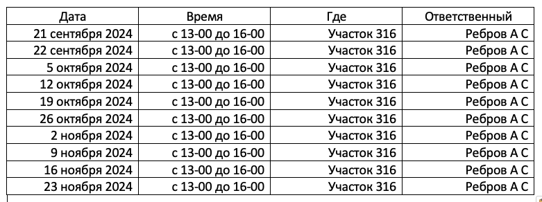 График может меняться в соответствии с погодой и личной занятостью членов правления. В случае изменения садоводы будут оповещены дополнительно. Вне указанного времени (напр. по будням) можем встретиться после дополнительного согласования времени встречи.