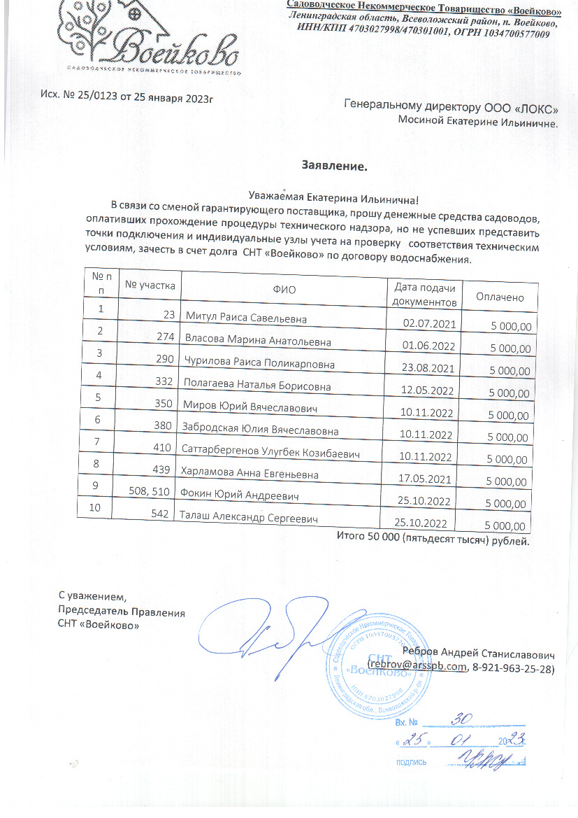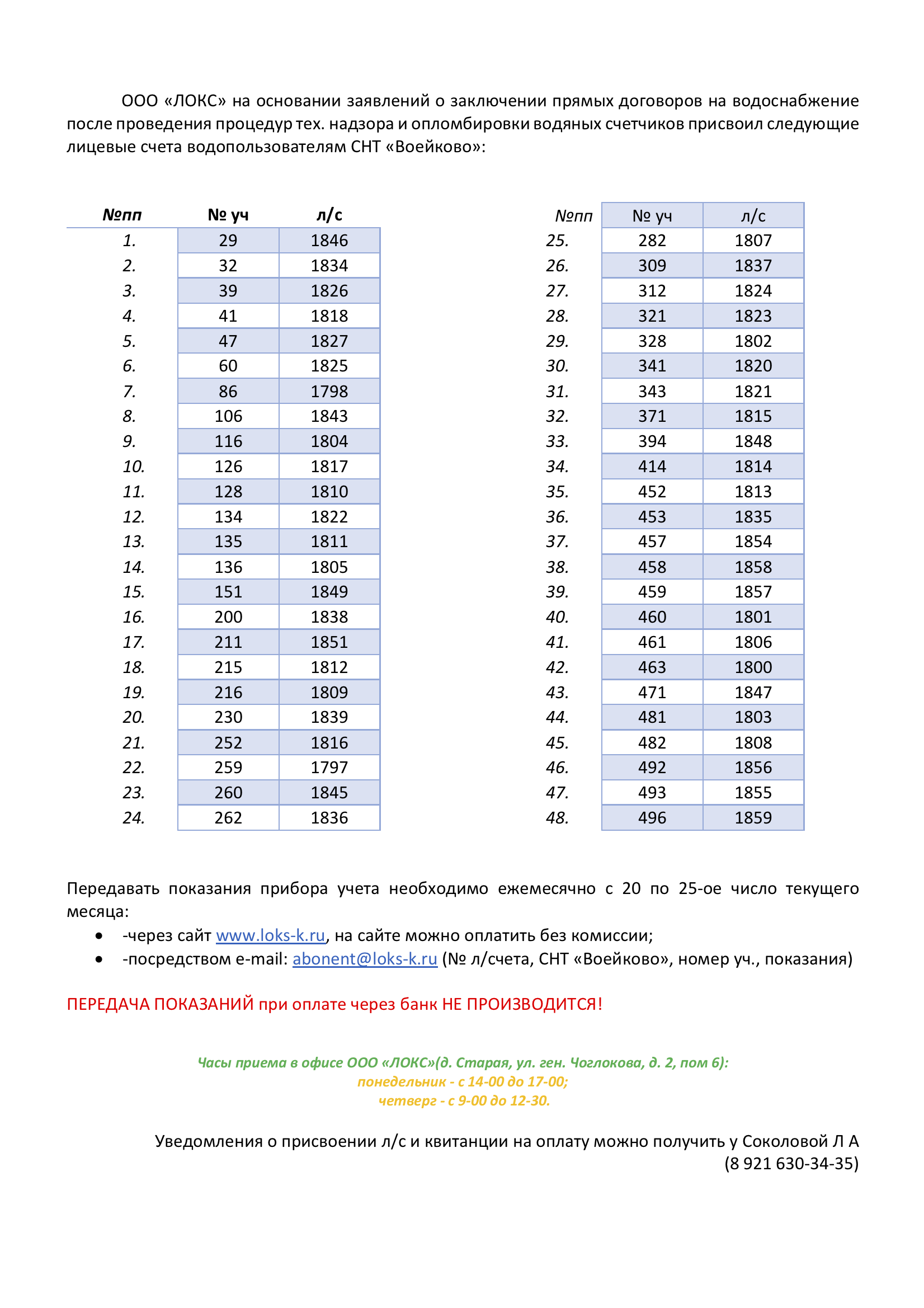 Дополнение к лицевым счетам, открытым "Водоканалом-Ладогой" для СНТ "Воейково"