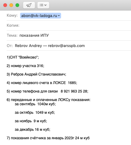 Как это и происходило всегда с 20 по 25 число текущего месяца нужно передать данные с ваших индивидуальных узлов учета (счетчиков). При этом найдите документы с показаниями переданными в ЛОКС за сентябрь, октябрь, ноябрь и декабрь 2022г. Эта информация необходима ООО "Водоканал-Ладога" для исчисления вашего среднего за месяц водопотребления для планирования и анализа производственных процессов.