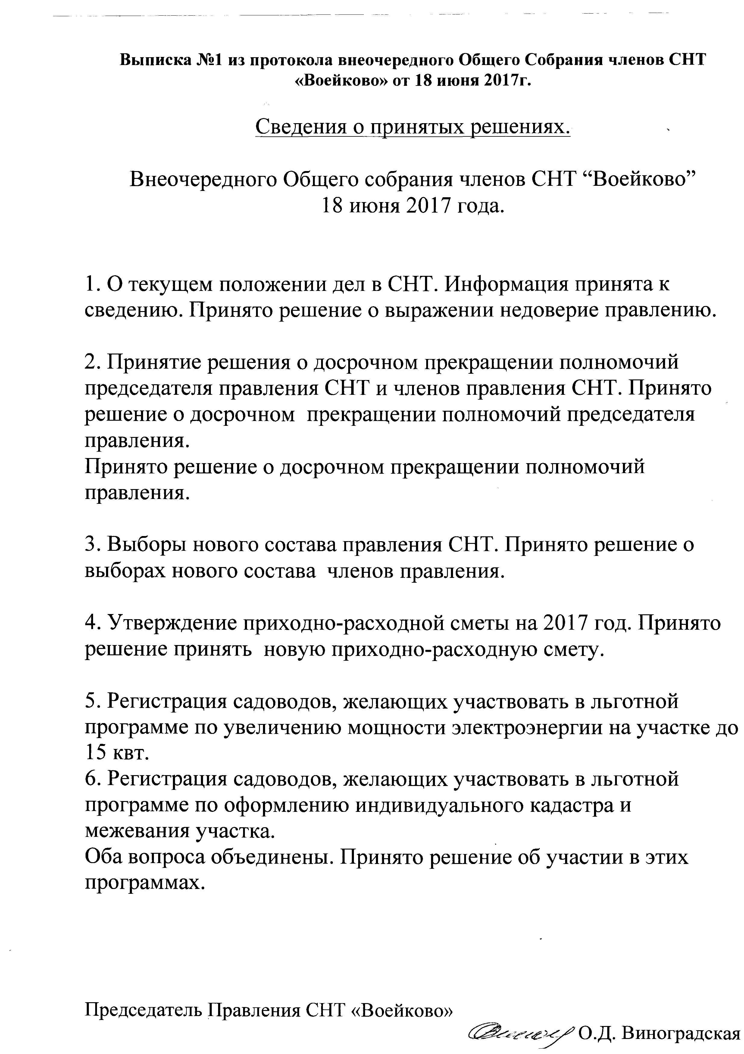 1. В связи с отсутствием желающих принять участие в выборах в органы управления СНТ (не поступило ни одного заявления), вопрос перевыборов в Повестку дня Общего Собрания не включен.