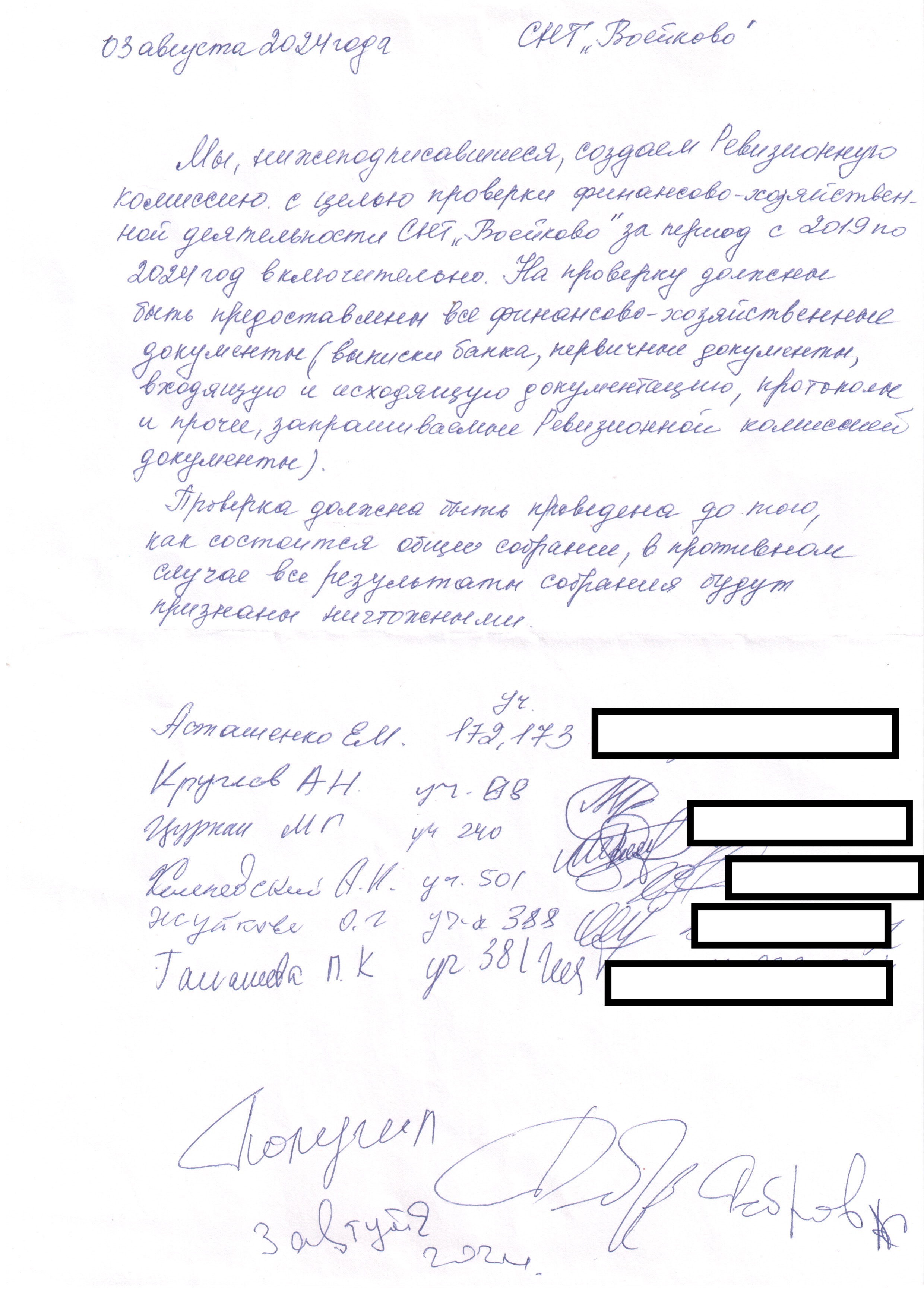 3 августа в адрес Правления поступило заявление от 5 граждан, проживающих на территории СНТ «Воейково» с уведомлением о создании Ревизионной Комиссии с целью-проверки фин-хоз деятельности….